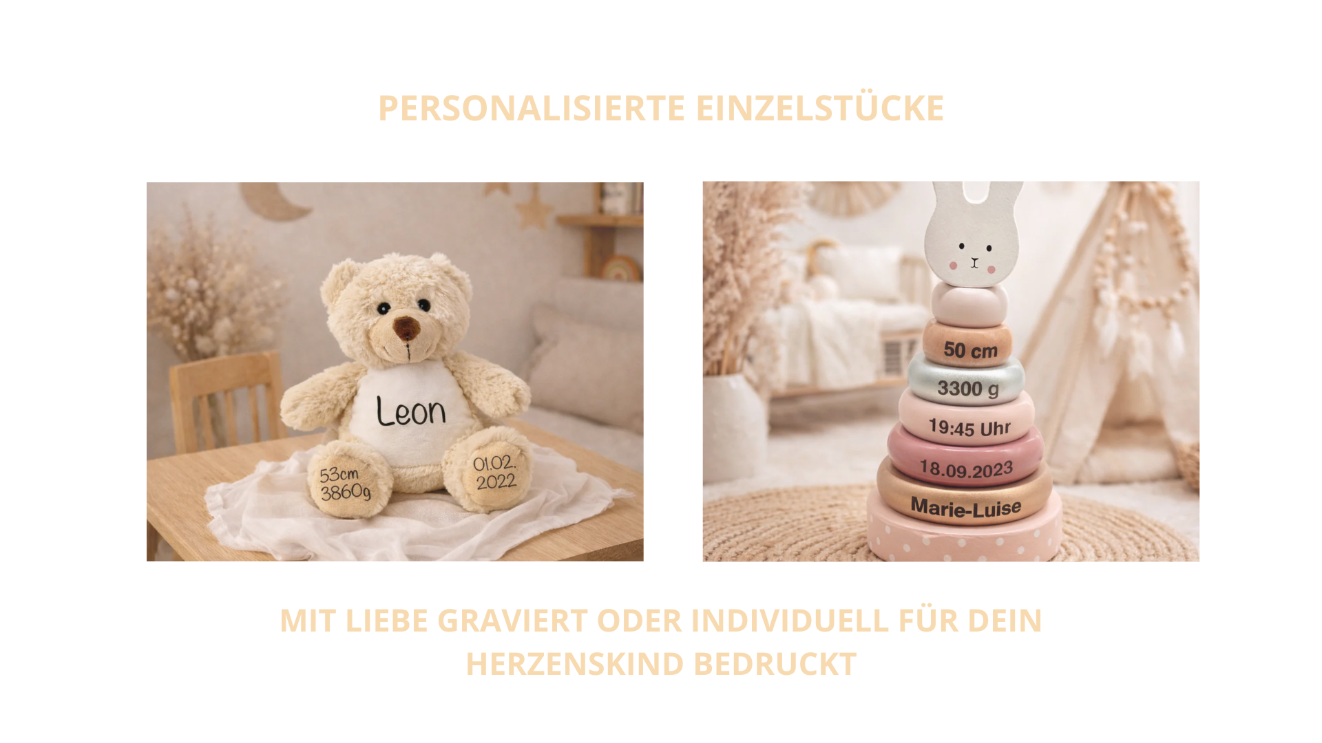 Personalisierte Geschenke sind besonders beliebt, weil sie individuell, emotional und einzigartig sind. Sie zeigen Wertschätzung und schaffen bleibende Erinnerungen für Kinder und ihre Familien. Ob Kuscheltiere mit Namen, Holzspielzeug, Textilien oder liebevolle Accessoires – unsere Produkte verbinden Persönlichkeit mit schönem Design.
