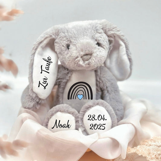 Personalized baptism gift – soft toy rabbit with name, baptism date & rainbow heart