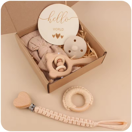 Personalized 6-piece baby gift set – with teething ring, pacifier chain & wooden card – ideal for birth or baby shower