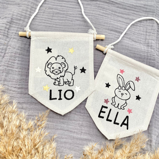 Fabric pennant with name and animal motif / children's room decoration