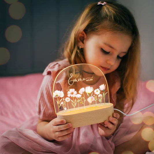 Personalized night light for children with pink flowers / name & date of birth